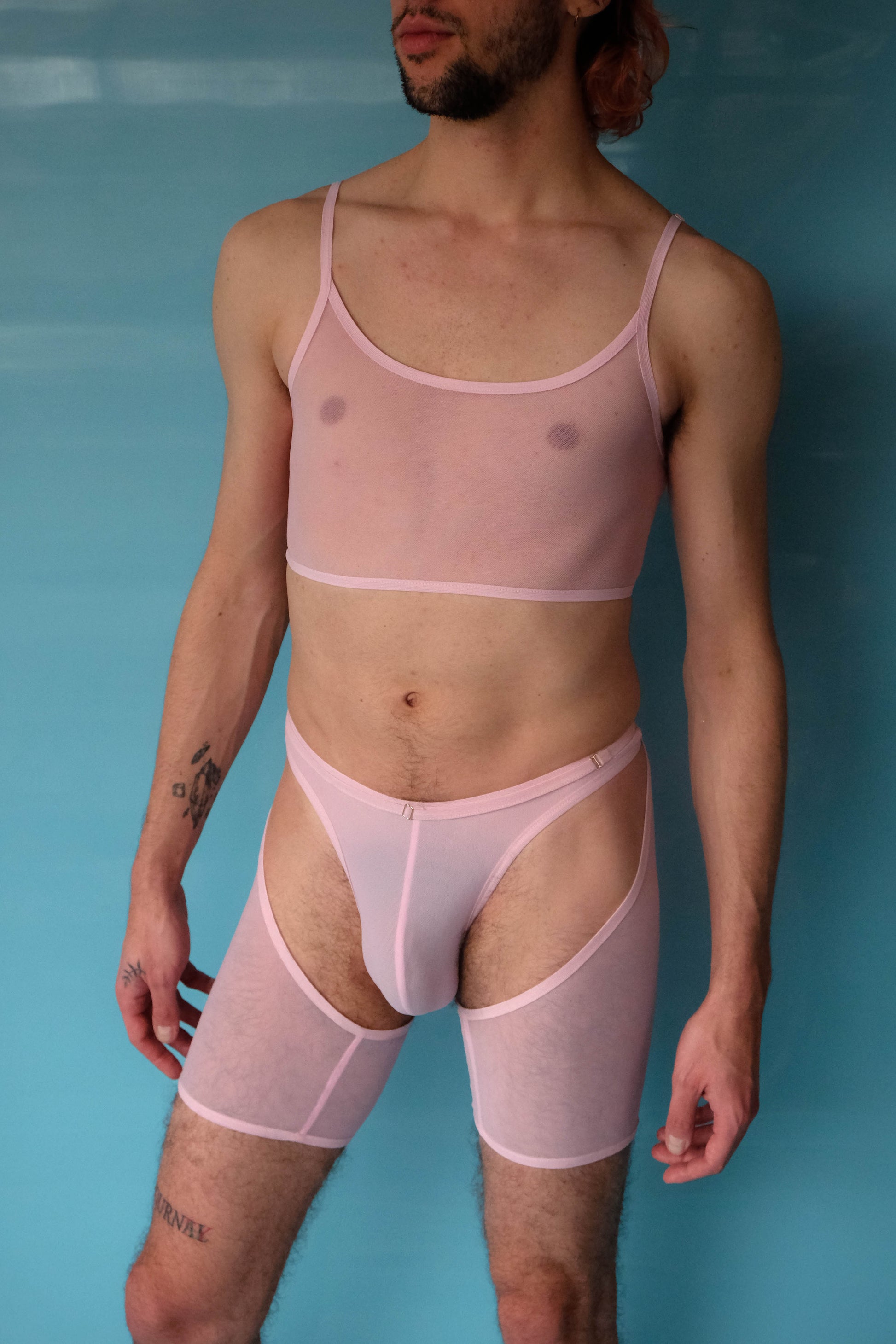 These cut-out mesh shorts are a nice frame for every butt. It can be worn with any of the thongs and bodies from the collection. The fabric is stretch, confortable and semi- transparent. The elastic at the waist can be fastened to reach the perfect fit. To chose your size please refer to the thigh measurement.